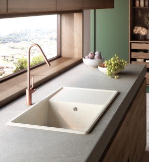 Fregadero sintético de una cubeta y escurridor, de la colección Trend, cuadrado y para montaje sobre encimera en un mueble mínimo de 60cm. Diseñado con líneas rectas para aprovechar al máximo la capacidad de la cubeta, permite instalar el grifo en el mármol, reversible. Se fabrica en todos los colores de nuestra gama. El diseño en tu hogar.